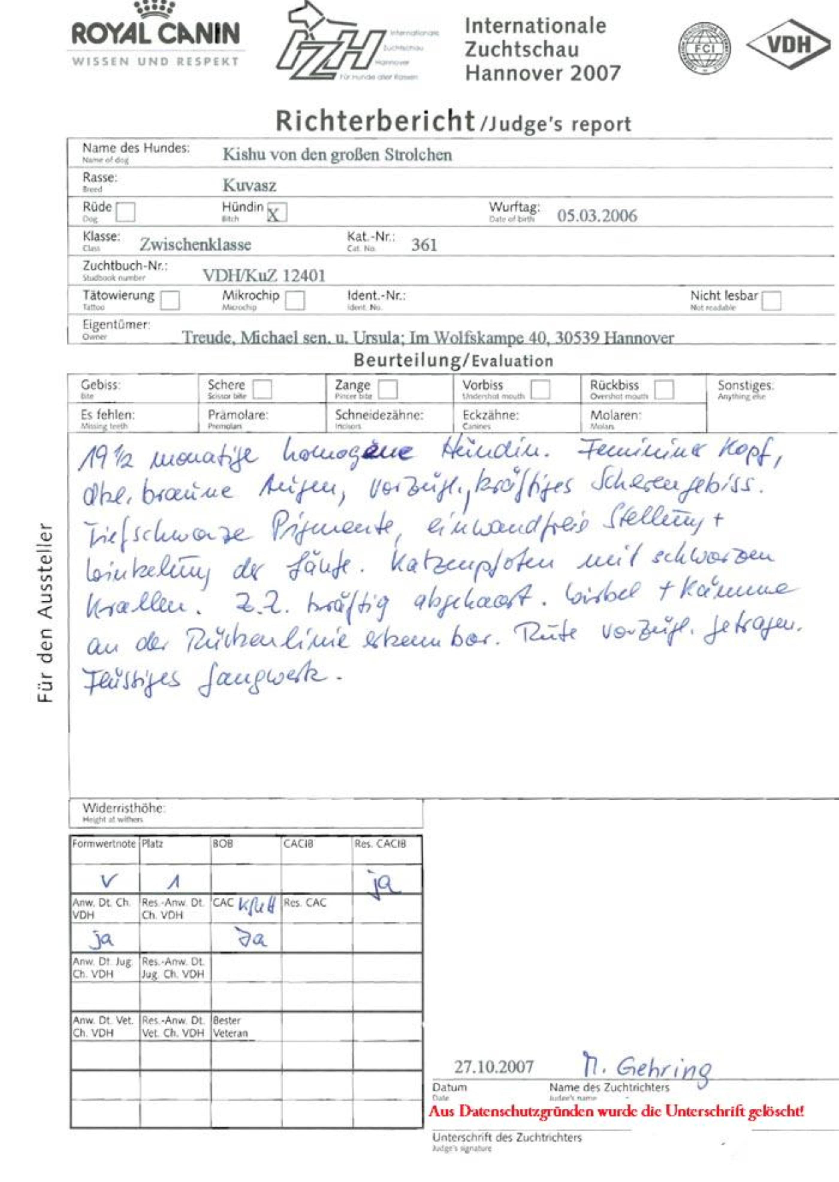 Formwertnote: V1, Anw. Dt. Ch. VDH, Anw. CAC KfUH, Res. Anw. CACIB, Richterin: Mira Gehring