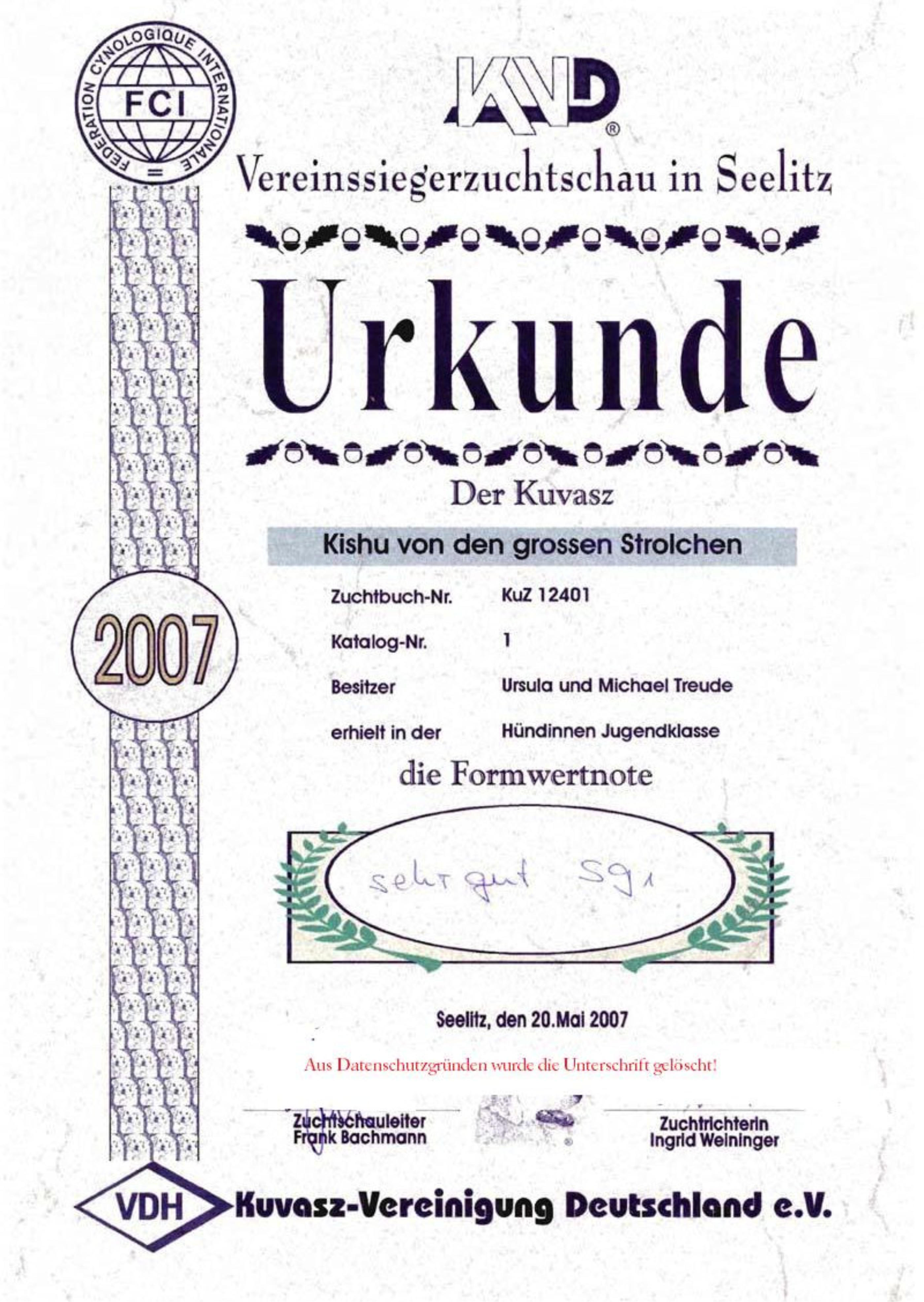 Kishu "von den großen Strolchen" * 5. März 2006 KVD Vereinssieger-Zuchtschau 2007 in Seelitz am 20. Mai 2007, Jugendklasse Formwertnote: Sg1, Richterin: Ingrid Weininger (D) Ein Klick aufs Bild vergrößert sie