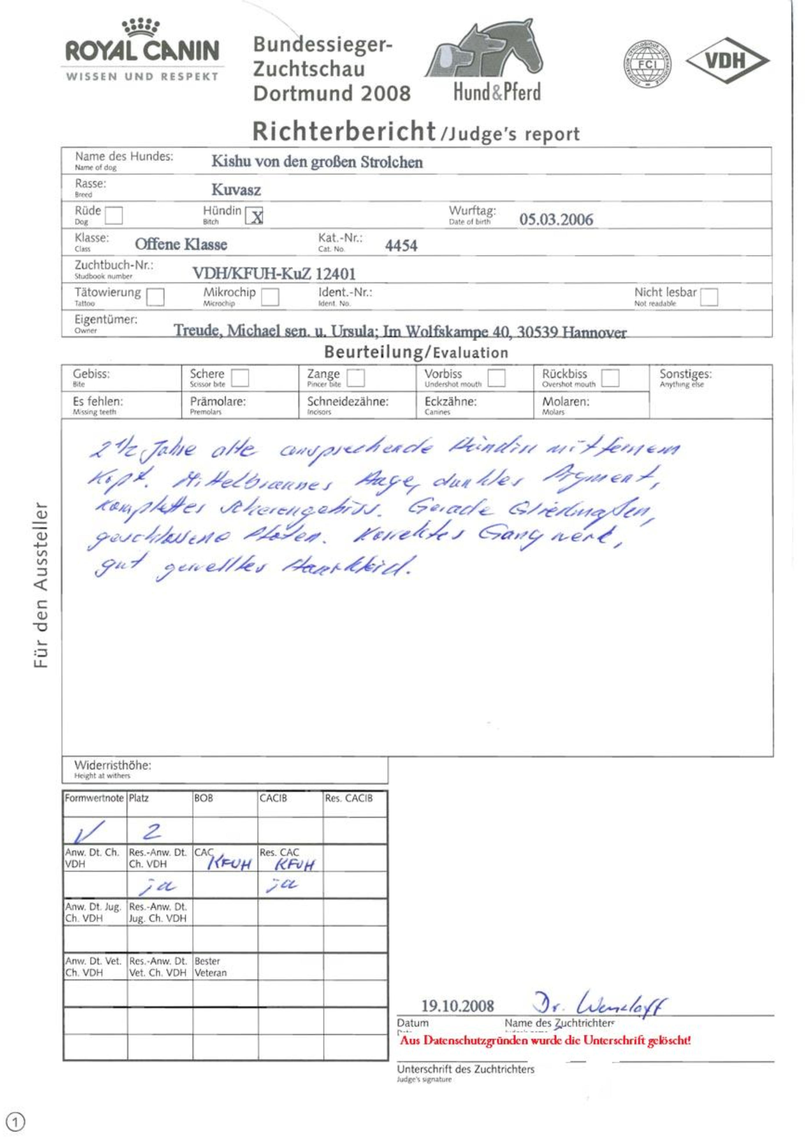 Bundessieger-Zuchtschau Dortmund 2008 am 19. Oktober 2008, Offene Klasse Formwertnote: V2,