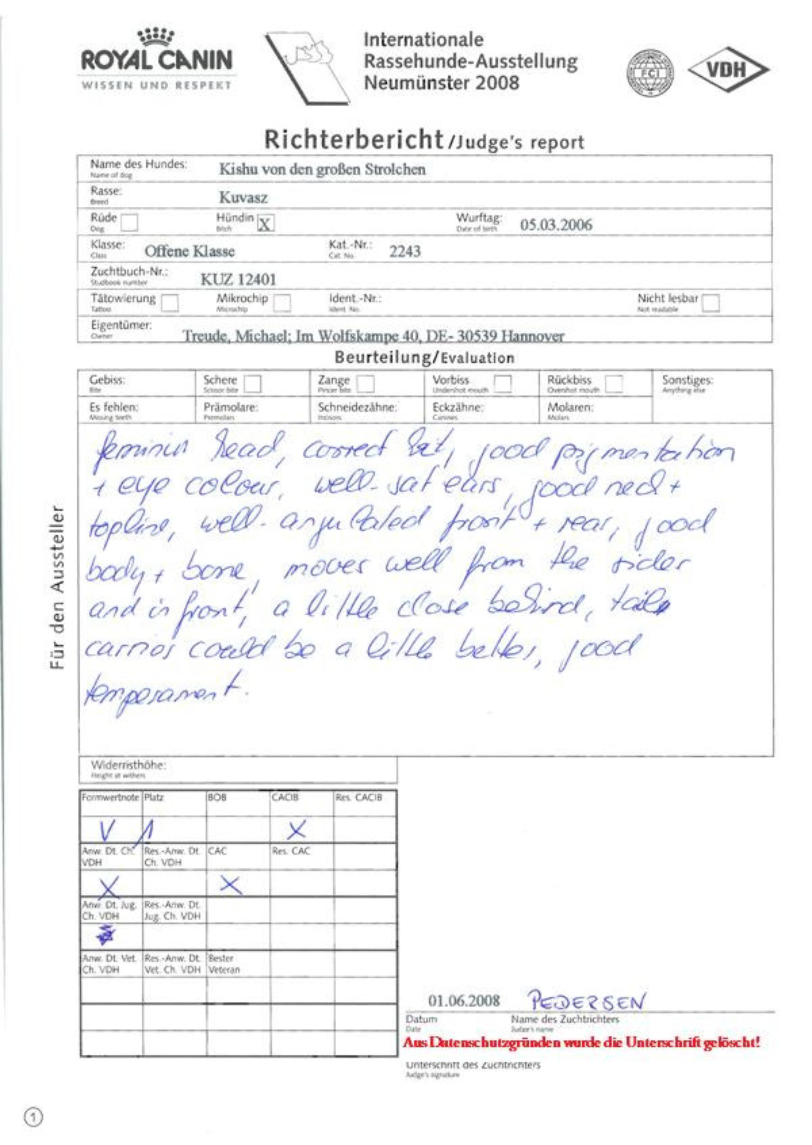 Formwertnote: V1, Anw. Dt. Ch. VDH, CAC , CACIB, Richter: Hans Erik Petersen, DK