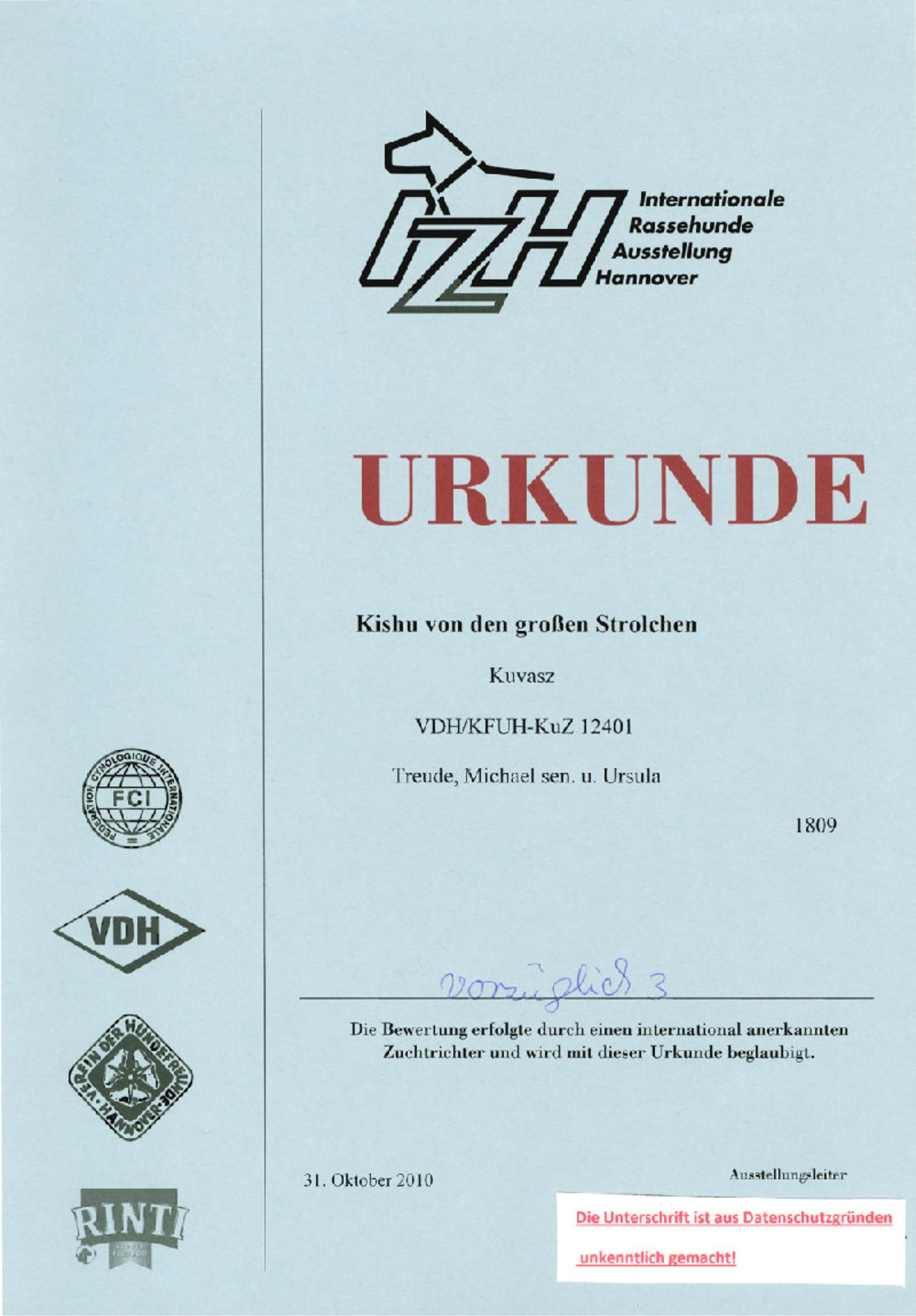 Kishu "von den großen Strolchen" * 5. März 2006IRA - Internationale Zuchtschau Hannover 2010 , offene Klasse, Formwertnote: V3, Richter: Norbert Roling (D)Wie das so ist in einem Wettbewerb, nur einer kann der Sieger sein! Aber von dem bekannten HD Ergebnis von Kishu ausgehend, können wir wirklich nicht klagen. Es gibt zwar immer noch "flüssige Bewegungsabläufe" aber einem erfahrenen Richter fällt eben doch schon auf, das gegenüber den anderen Hunden da etwas nicht (mehr) ganz so perfekt läuft. Deshalb geht auch der 3. Platz vollkommen in Ordnung, wobei man natürlich nicht vergessen darf, es steht immer noch ein "V" für Vorzüglich vor dem Platz! Die Zeit wird aber kommen, da ist es auch damit vorbei, dann stellt sich natürlich die Frage nach dem Sinn einer Teilnahme. Aber noch haben wir Hoffnung das wir ab und zu doch noch einen "Blumentopf" gewinnen... Man sollte sich aber auch eingestehen können, das die anderen einfach besser waren, somit auch verdient gewonnen haben. Ein Klick aufs Bild vergrößert sie